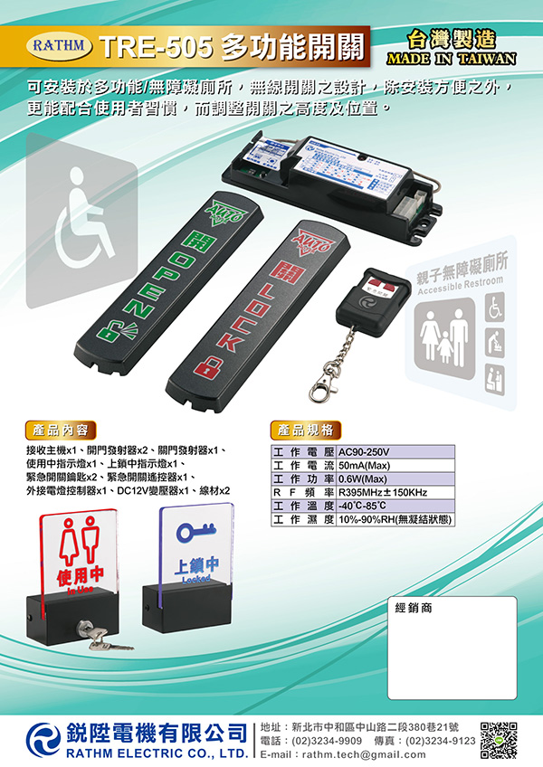 可安裝於多功能/無障礙廁所,無線開關之設計,除安裝方便之外,更能配合使用者習慣,而調整開關之高度及位置。